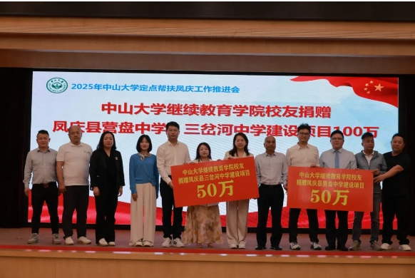 在中山大学定点帮扶凤庆工作调研推进会上,继续教育学院校友捐赠凤庆营盘中学和三岔河中学建设项目100万元,并举行了两所中学逸仙楼揭牌仪式。活动期间,校友们还参加了临沧凤庆招商推介会,考察调研了茶叶、核桃、文旅等项目,了解中大“凤庆计划”乡村振兴成果以及产业发展投资机会。