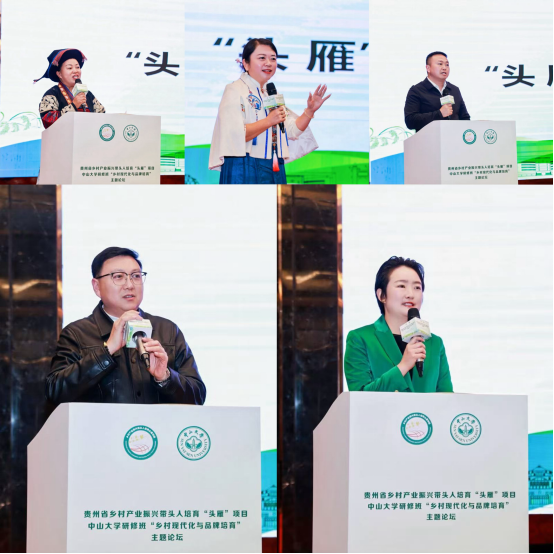 “头雁”我来讲环节,全国人大代表、岑巩县塔山村党支部书记、村委会主任郑培坤、贵州彩妞农业有限公司总经理黄美玲、贵州贵农建丰现代生态农牧科技公司董事长王建丰、贵州媚娑霓非遗文化发展有限公司负责人韦厚珍、茅台镇一九一五酒厂廖丹丹等5位学员代表,分享了成长历程、创业心得、创新成果和培育成效,生动展现了贵州“头雁”联农带农示范效应。